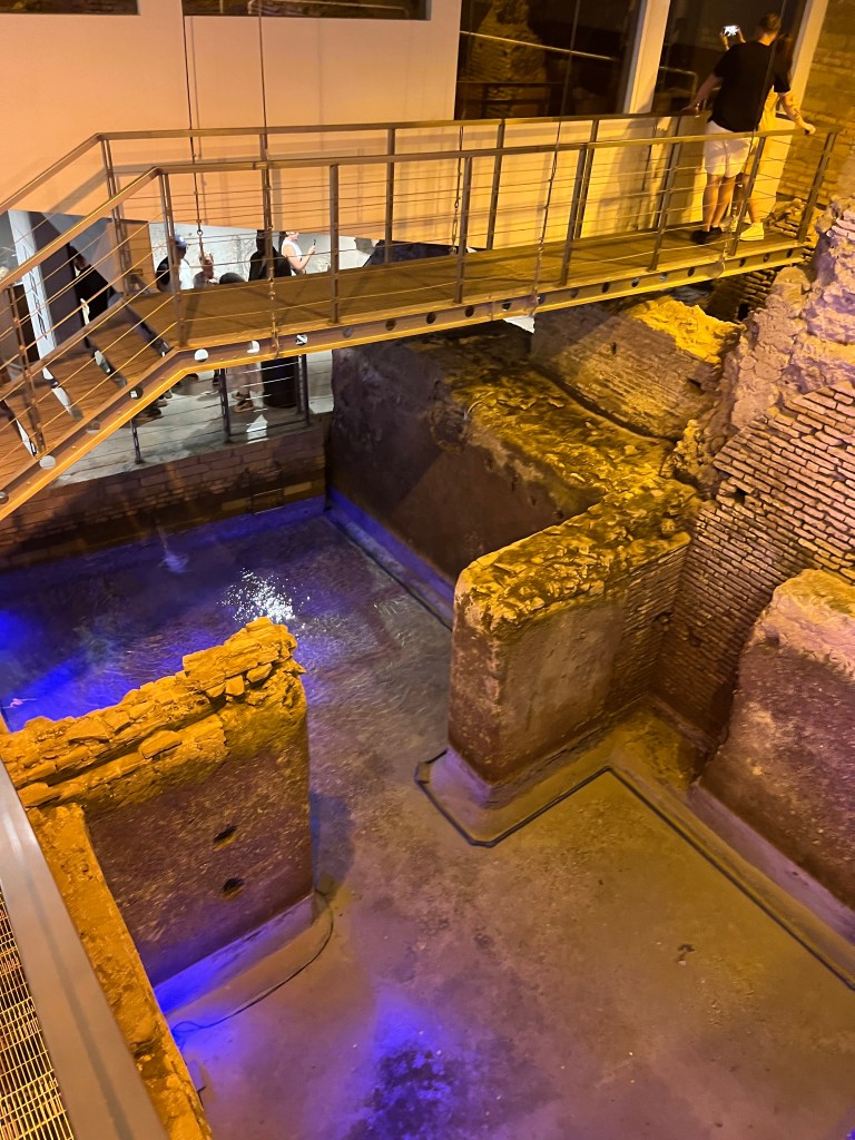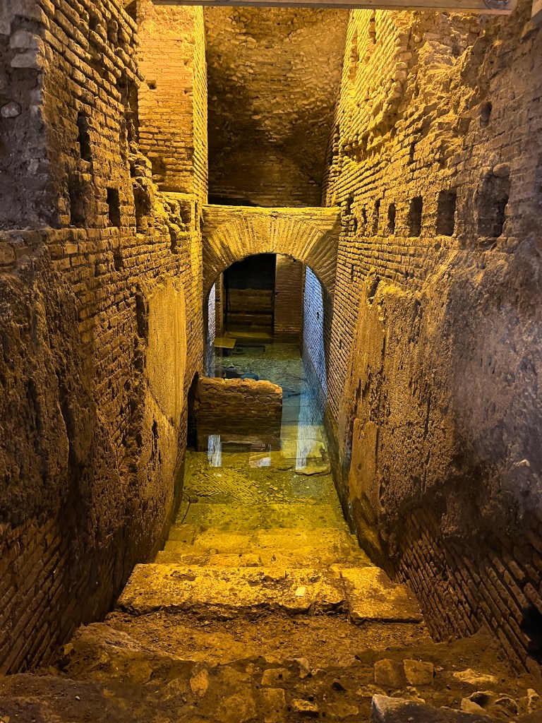 La fontaine de Trevi, c’est un des emblèmes de la ville de Rome. À toute heure du jour et de la nuit vous y trouverez des centaines de personnes qui grouillent autour. Zéro plaisir, on est d’accord. Alors on va s’en éloigner un petit peu, dans une ruelle à quelques pas de là se trouve l’entrée d’un petit musée archéologique (le Vicus Caprarius) où on n’entre que par groupe de 20 personnes. Il est donc obligatoire de réserver sa place à l’avance.