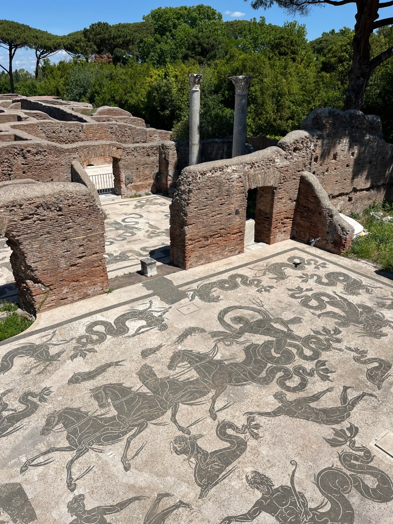 Sur 34 hectares Ostia Antica, l’ancien port, s’offre à vous avec des beautés à couper le souffle (je pense particulièrement aux échoppes en face du théâtre avec des mosaïques devant chaque porte, représentant ce que l’on allait trouver à l’intérieur du magasin). J’en ai fait une vidéo complète tellement cette visite m’a époustouflée !